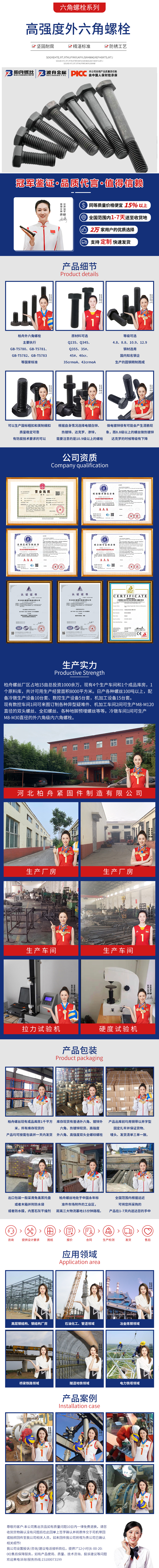 產(chǎn)品介紹: 柏舟外六角螺栓主要執(zhí)行GB-T5780、GB-T5781、GB-T5782、GB-T5783等國家標(biāo)準(zhǔn)。原材料可選Q235、Q345、Q355、35 、45 、40cr、35crmoA、42crmoA,等級可選4 8、8 8、10 9、12 9。鋼材選用國內(nèi)知名鋼企生產(chǎn)的圓鋼精制而成,可以生產(chǎn)國標(biāo)粗扣和英制細(xì)扣,質(zhì)量穩(wěn)定可靠。有防腐技術(shù)要求的可以根據(jù)自身情況選擇電鍍白鋅、熱鍍鋅、達(dá)克羅、滲鋅,外六角使用范圍是標(biāo)準(zhǔn)件里面最廣泛的。