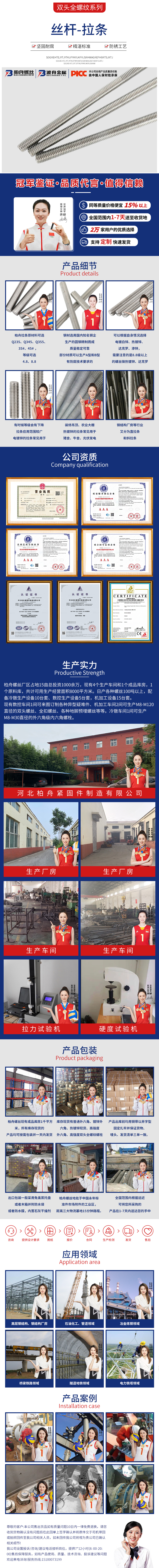 產(chǎn)品介紹:柏舟拉條原材料可選Q235、Q345、Q355、35 、45 ,等級(jí)可選4 8、8 8。鋼材選用國內(nèi)知名鋼企生產(chǎn)的圓鋼精制而成,質(zhì)量穩(wěn)定可靠,部分材質(zhì)可以生產(chǎn)A型和B型。有防腐技術(shù)要求的可以根據(jù)自身情況選擇電鍍白鋅、熱鍍鋅、達(dá)克羅、滲鋅,需要注意的是8 8級(jí)以上的螺絲做熱鍍鋅、達(dá)克羅的時(shí)候等級(jí)會(huì)有一定的下降。拉條應(yīng)用范圍較廣,電鍍鋅的拉條常見用于裝修吊頂、農(nóng)業(yè)大棚。