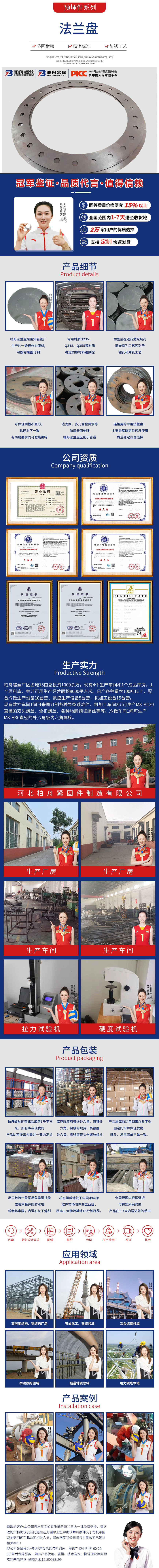 產(chǎn)品介紹:柏舟法蘭盤采用知名鋼廠生產(chǎn)的一級(jí)板作為原料,可按需來圖訂制。常用材質(zhì)Q235、Q345、Q355等材質(zhì)穩(wěn)定的原材料進(jìn)數(shù)控切割后在進(jìn)行激光切孔。激光割孔工藝區(qū)別于鉆孔和沖孔工藝,可保證鋼板不變形,孔徑上下一致。有防腐要求的可做熱鍍鋅、達(dá)克羅、多元合金共滲等防腐表面處理。柏舟法蘭盤區(qū)別于管道連接用的專用法蘭盤,主要是基礎(chǔ)定位預(yù)埋使用,質(zhì)量穩(wěn)定靠譜選擇